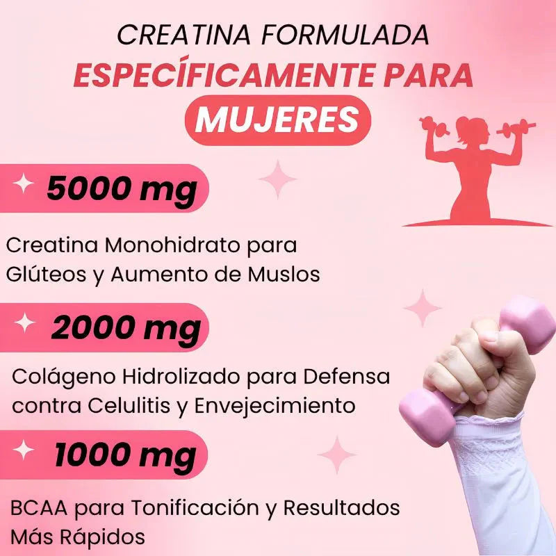 Nuestra Creatina está formulada exclusivamente para mujeres, combinando creatina premium + colágeno. No es una fórmula masculina "adaptada", es pensada desde cero para ti.