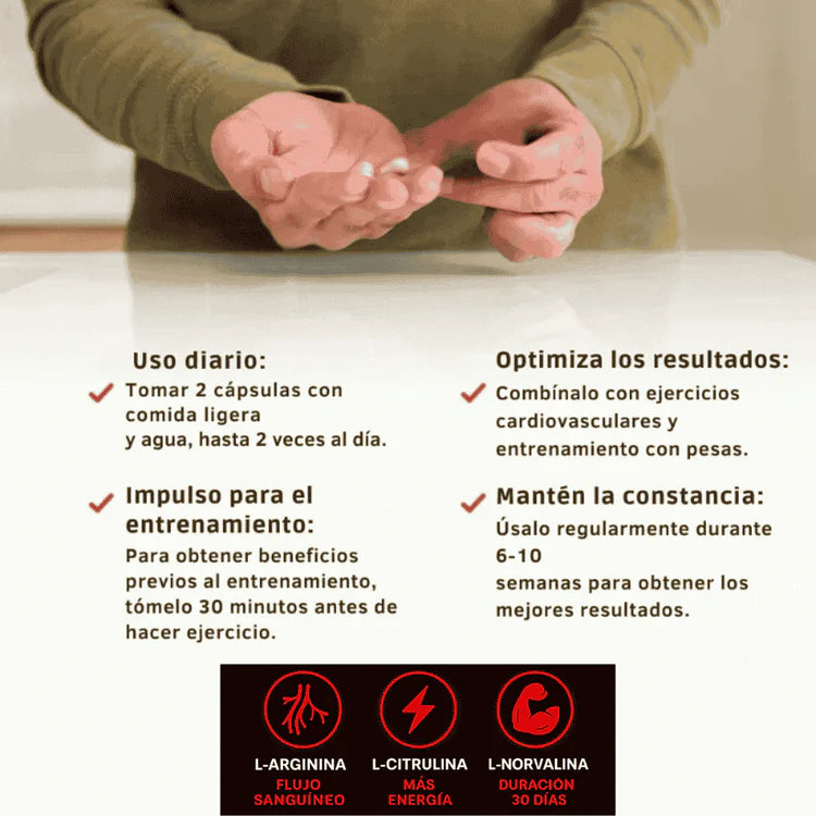 Se recomienda tomar de2 cápsulas al día, preferiblemente30–45 minutos antes de entrenar, con un vaso de agua. No exceder la dosis indicada en la etiqueta del envase.